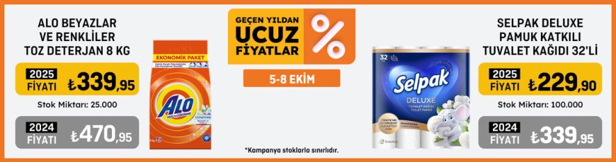 Migros, ekim ayına tüketicilerin bütçesini rahatlatacak büyük bir indirim kampanyası ile başladı. 5-8 Ekim tarihleri arasında geçerli olacak bu kampanya kapsamında temizlik ve hijyen ürünlerinde dikkat çekici fiyatlar sunuluyor. Özellikle Alo 8 kg toz deterjan ve Selpak Deluxe 32’li tuvalet kağıdı, geçen yıla kıyasla çok daha uygun fiyatlarla satışa çıktı. Migros’un başlattığı bu fırsat, hem mağazalarda hem de online alışverişte geçerli olup, stoklarla sınırlı olarak tüketicilere ulaştırılıyor.